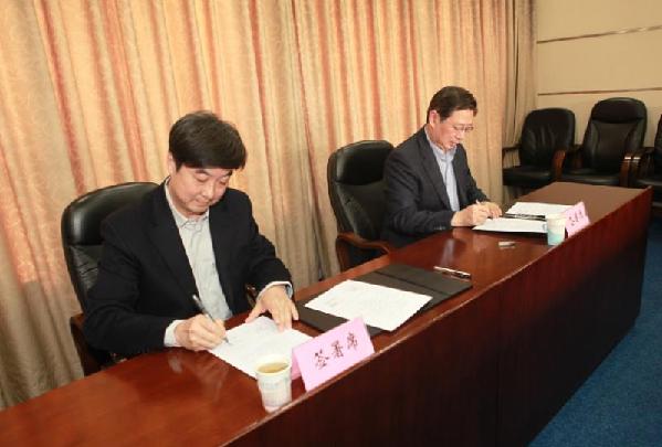 中国公证协会会长郝赤勇(左)与中国社会保险学会会长胡晓义(右)在签约仪式上代表双方签字。