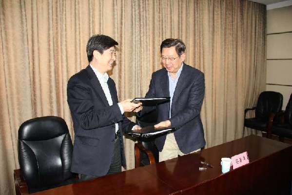 中国公证协会会长郝赤勇(左)与中国社会保险学会会长胡晓义(右)交换“公证养老”合作协议。